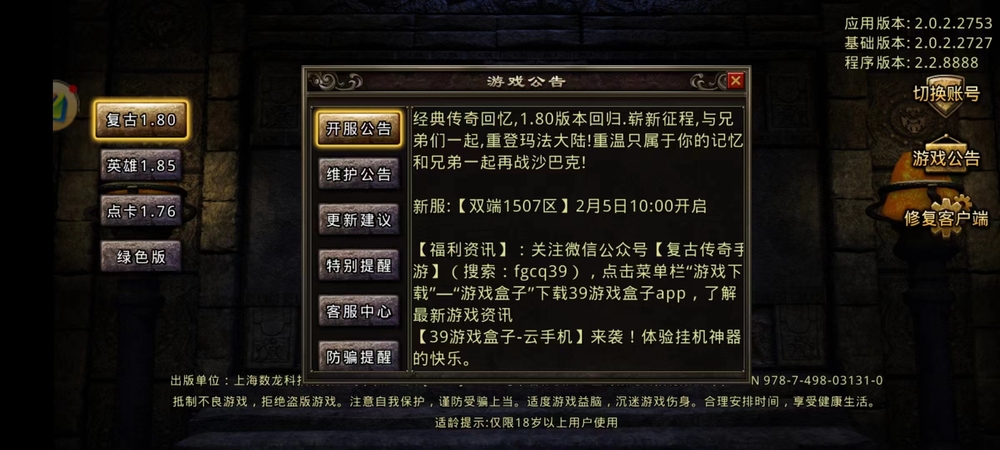 复古传奇1.80丨“双端1507区”02月05日10点开启13